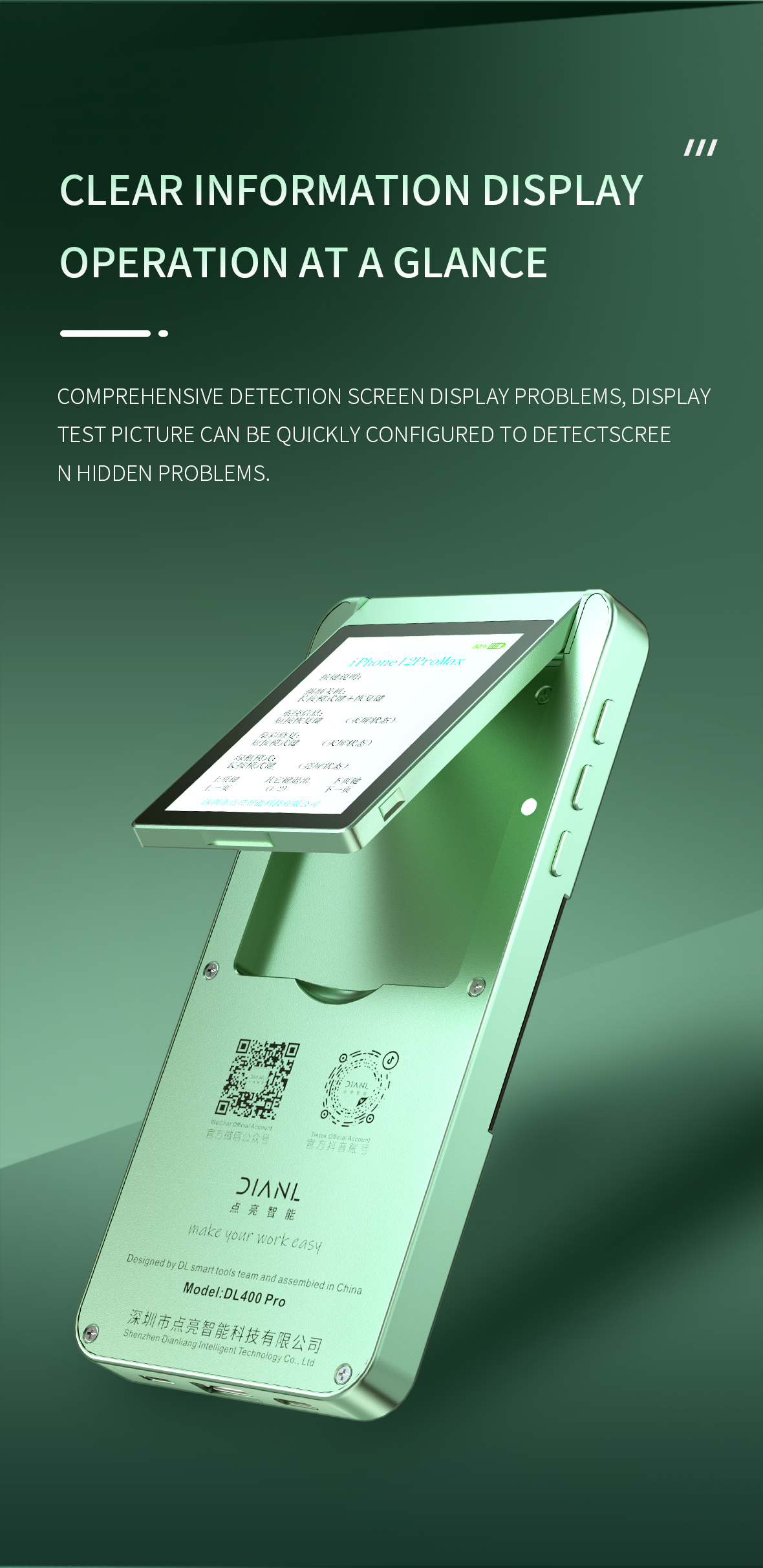 This DL400 Pro Smart Screen Tester not only clearly displays information, but also operates at a glance. Comprehensively detect screen display problems, display test pictures can be quickly configured, and detect screen hidden problems. Power-on information/test screen information/current and voltage information/original color repair/test display/test touch/test 3D/original color repair.