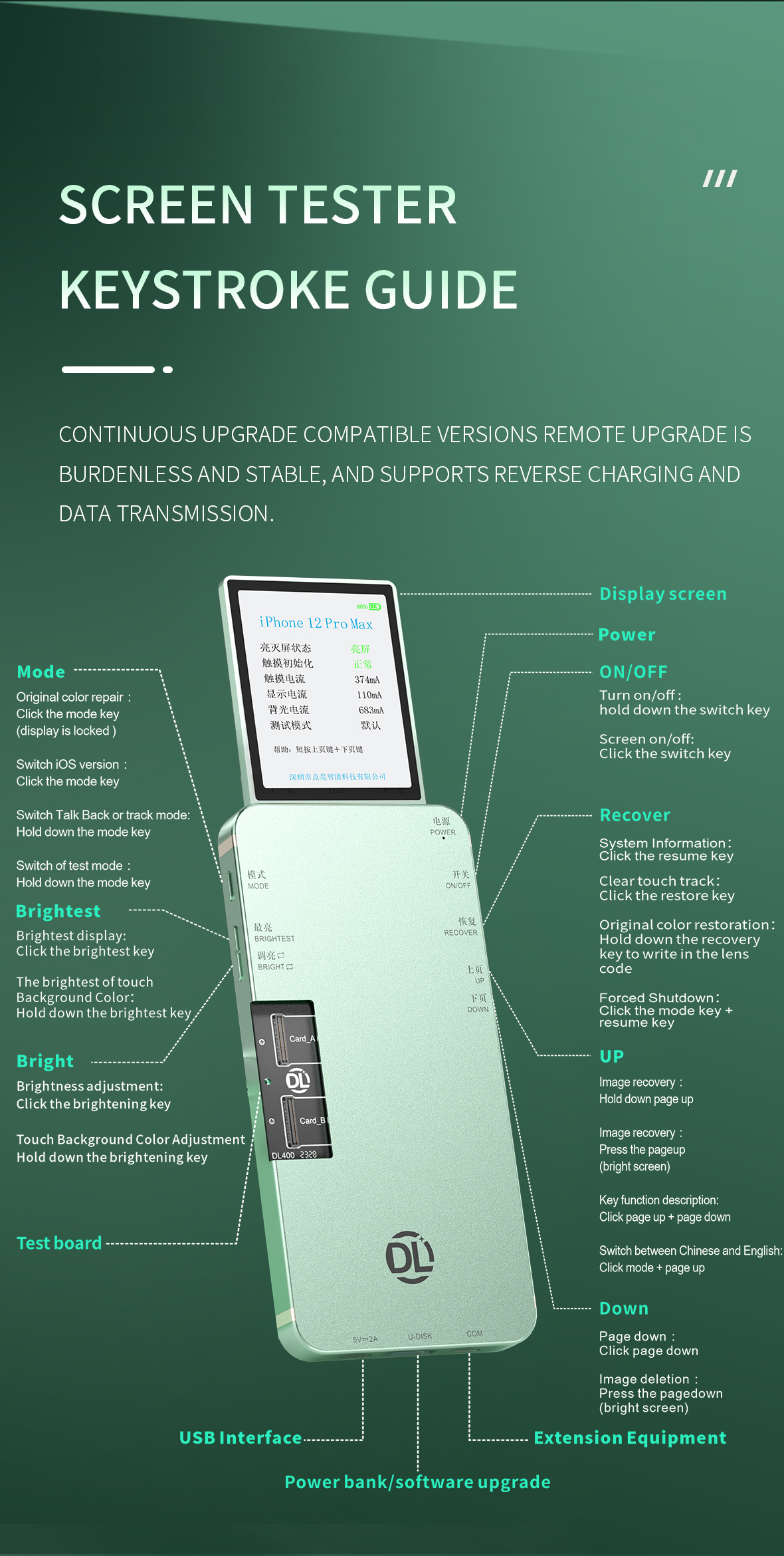 The selling point of the original color repair: DL400 Pro Smart Screen Tester supports the original color repair to make the display more vivid. Continuously upgrade the compatible version, remote upgrade without burden, strong stability, support reverse charging and data transmission.