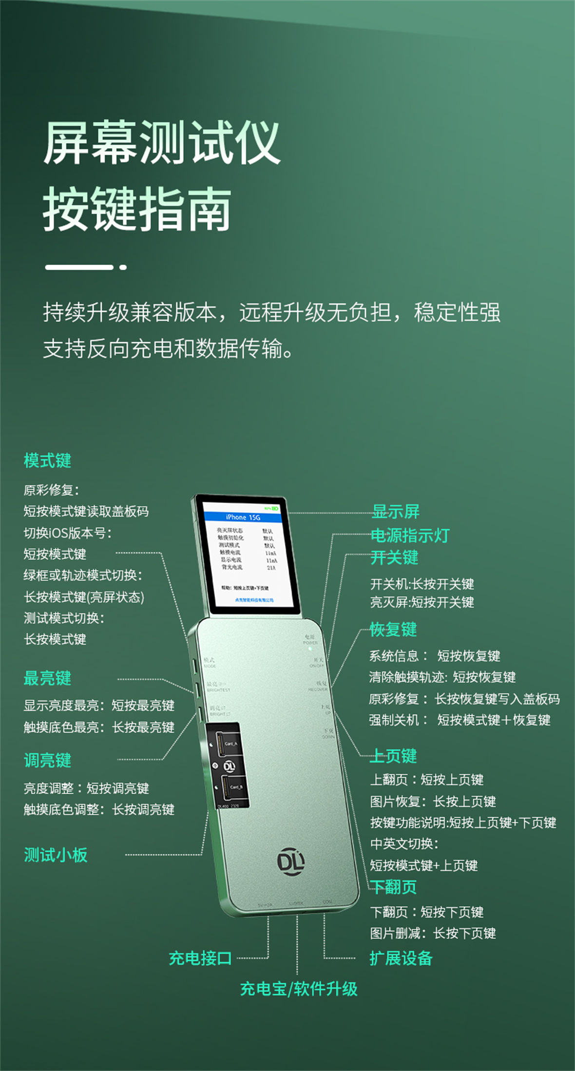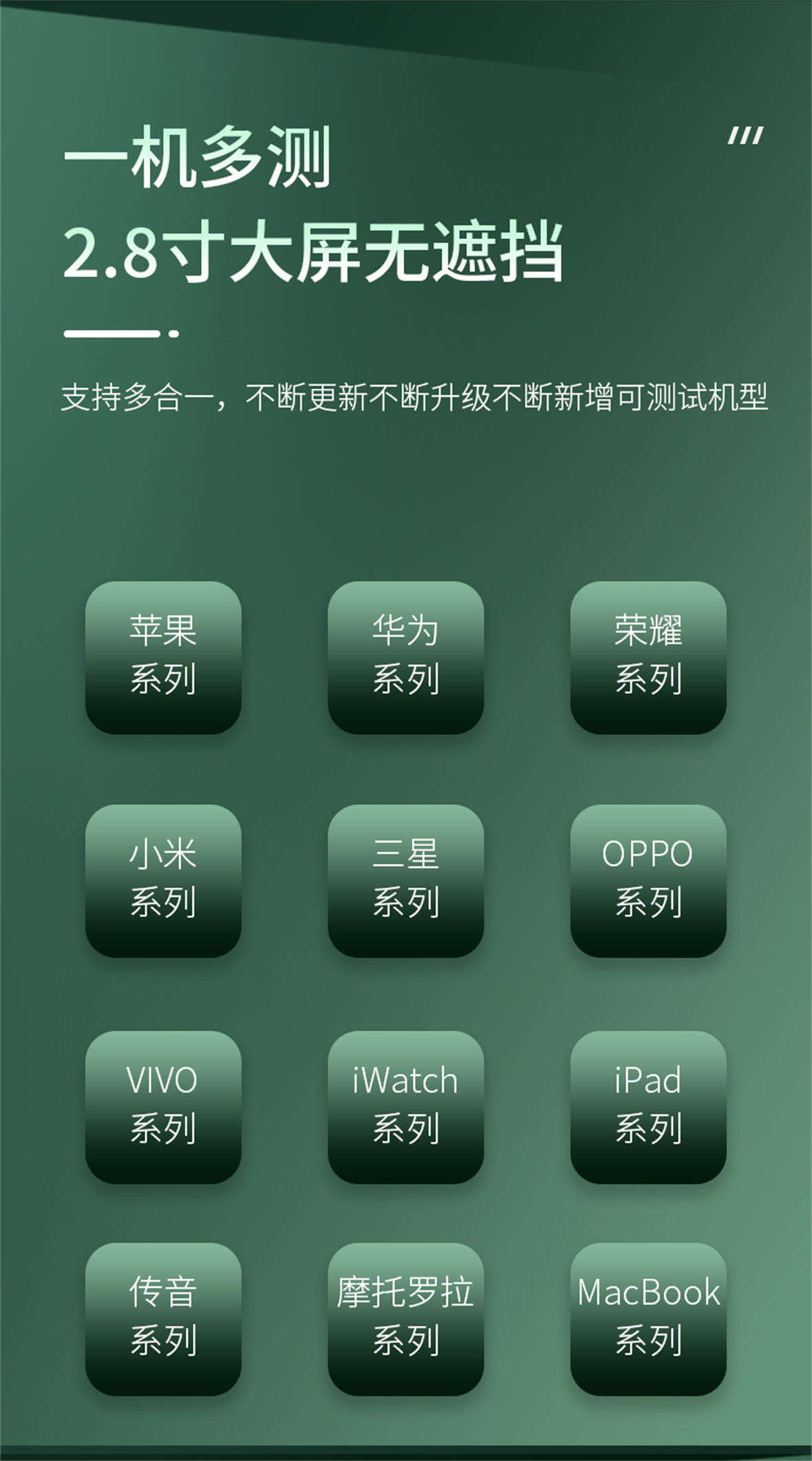 測屏準(zhǔn)確全面,功能專業(yè)穩(wěn)定,2.8寸超大顯示屏,全面升級系統(tǒng)穩(wěn)定性,支持FOG測試,操作簡便易用,優(yōu)化電池管理方案,支持外擴(kuò)按鍵,支持遠(yuǎn)程升級,一鍵強制關(guān)機(jī),外觀小巧便攜,多方式專業(yè)售后服務(wù)